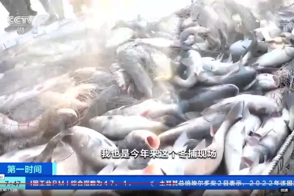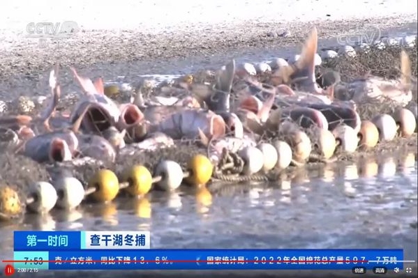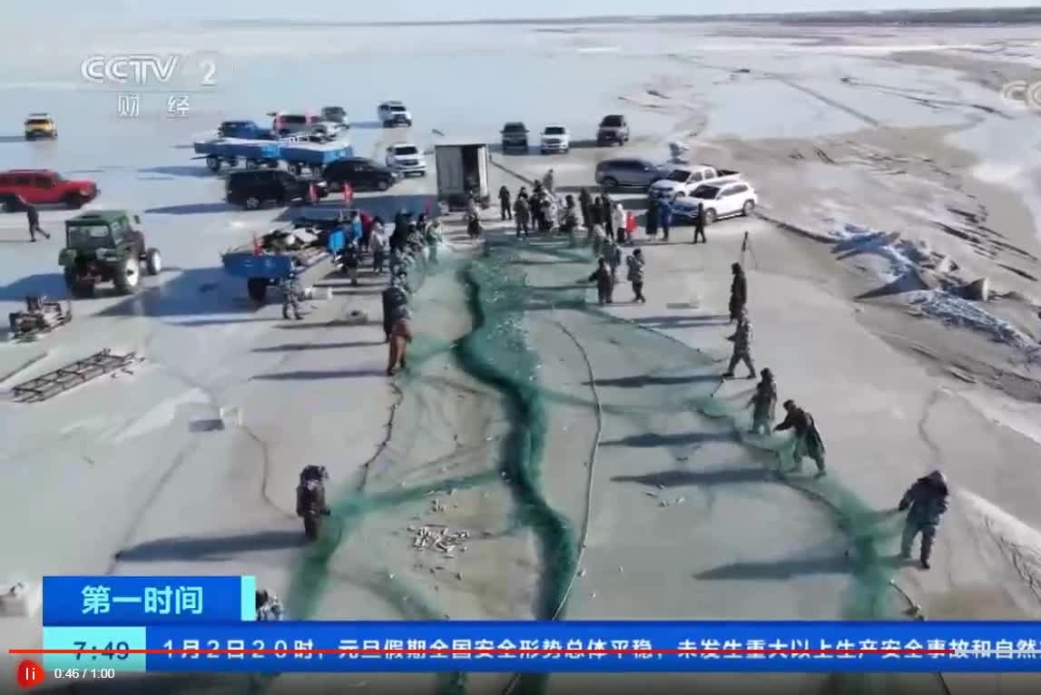 吉林松原:千米大網合圍魚群 冬捕隊拉網出水