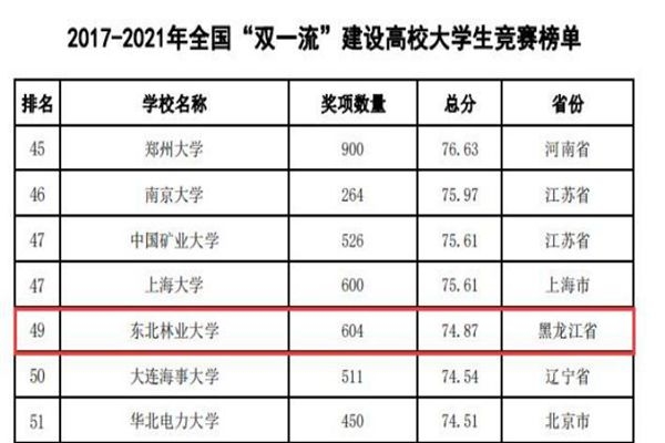 東北林業大學連續四年蟬聯全國農林類本科院校大學生競賽排行榜榜首