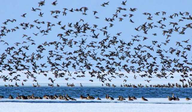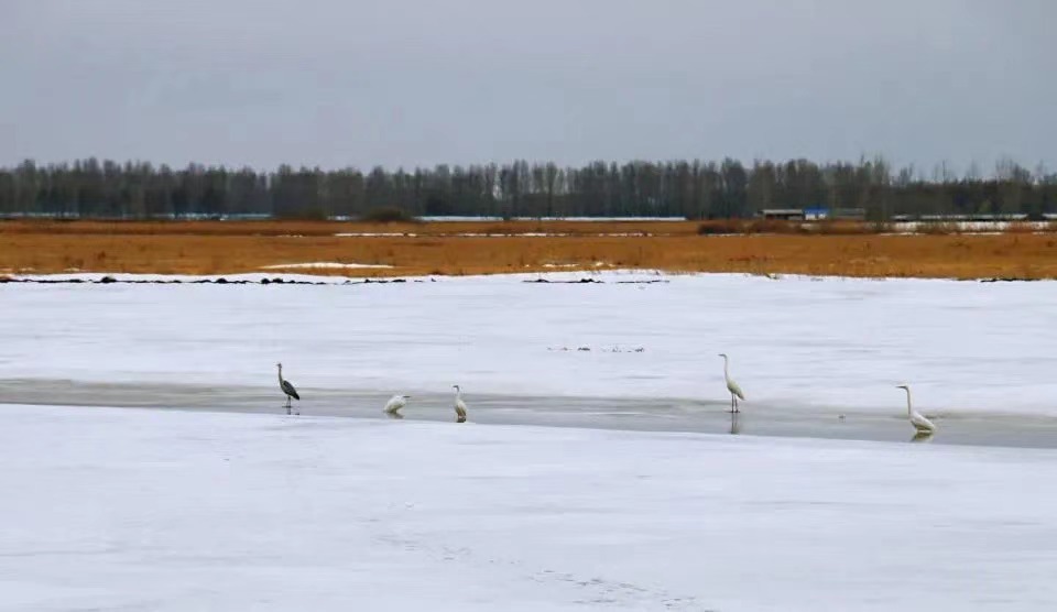 在雁窩島國家級生態濕地自然保護區內的冰面上,白鸛、灰鸛還有小水雞,三五一組,有的悠閑散步,有的仰頭眺望,有的在融化的雪水中覓食,還有的在低空盤旋。比往年提前10天到來的候鳥,為雁窩島增添了初春的氣息和生機。