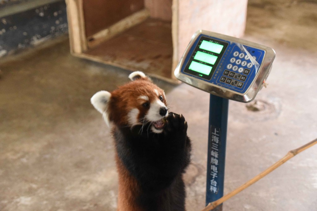 小熊貓對稱體重、量身高體長等體檢項目十分喜愛。因為飼養員們會用美食吸引它們走上體重秤,并在秤上直立身體量身高。小熊貓“小豆包”體檢時會展現出聰明又粘人的本性,抱住秤不撒爪,撒嬌賣萌很是可愛。