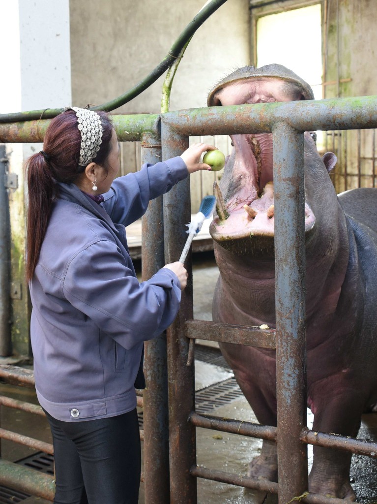 對于成年河馬除了身高體重測量,還要多加一項口腔檢查??纯茨菑堦懮溉閯游镏凶畲蟮淖炖铮谇?、牙齒是否健康。為更好觀察細節會先給河馬刷牙,河馬們對這種健康又舒適的特殊服務十分歡迎。