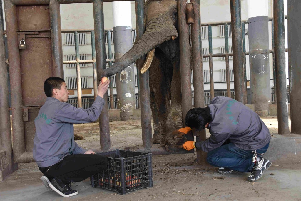 非洲象“豆豆”今年11歲,還在長身體。這次體檢發現,一個冬天“豆豆”個子長了6cm,體重長了150kg,牙齒長長,腿長粗,腳也長大了。更讓“豆豆”喜歡的是,量完腳還有專業的修腳服務。