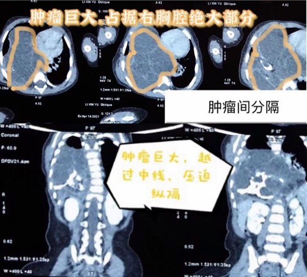 一周前,小彤彤因為氣喘、呼吸困難、惡心在當地醫院就診,胸片檢查提示隔膨升可能,為了明確診斷來到哈爾濱市兒童醫院心胸外科就診。戚家峰副主任為孩子進一步進行查體考慮是縱隔腫瘤,通過胸部CT增強造影檢查更加清晰的看到腫瘤的特殊性,該腫瘤幾乎占滿右側胸腔,縱隔被擠壓后導致移位,心臟、食管均有不同程度的受壓影響。而且這個巨大的腫瘤由很多分隔組成,分隔中含有的物質又不同,有囊性組織、實性組織和鈣化組織,考慮畸胎瘤可能。