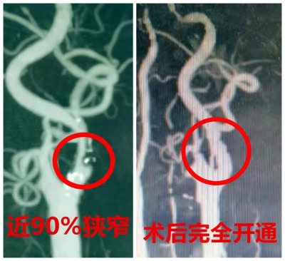 在神經外一科醫護團隊的精心管理及護理下,張大爺術后第二天即可下地活動,肢體反復癱瘓等癥狀消失,并且左眼視物不清的癥狀消失。復查頸部CTA檢查,左側頸內動脈管徑完全恢復正常,避免了腦卒中發生的危險。