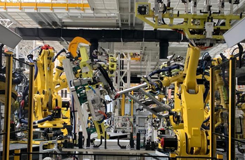 資料圖:江西上饒一家新能源電動汽車公司的智慧工廠內,機器人正同時作業?!±铐嵑?攝
