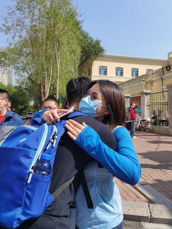 站在學校門前的哈市第一中學化學何老師通過擁抱為考生助威。
