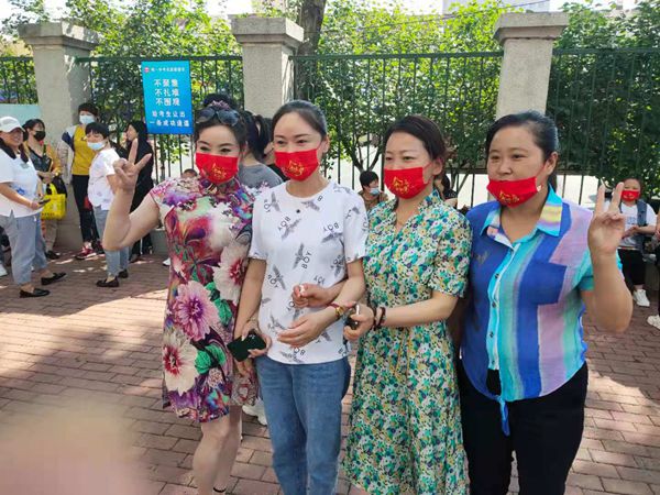助考媽媽,口罩上的文字為金榜題名,圖左家長身穿旗袍,寓意旗開得勝。