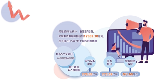據同花順iFinD統計,截至6月7日,滬深兩市兩融余額達到17362.38億元,創下自2015年7月上旬以來的新高;截至6月8日,融資余額為15857.35億元,同樣創下2015年7月上旬以來的新高。