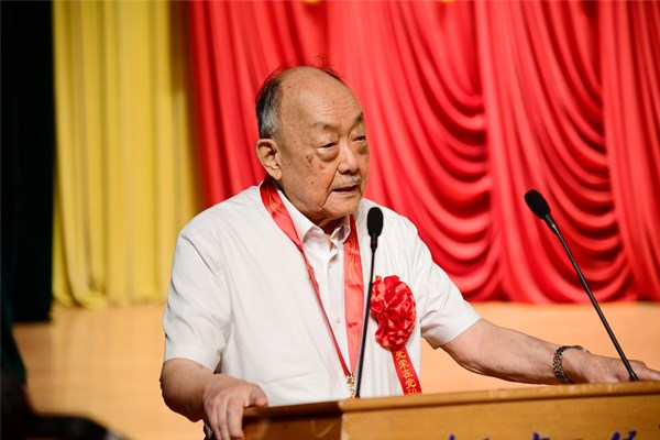 大會為“光榮在黨50年”的老黨員代表頒發紀念章,楊士莪院士作為黨齡56年的老黨員,發表了獲獎感言,他說,“我們這批在黨的關懷和培養教育下成長起來的一代,在黨的百年生日的時候,說實話心里千言萬語不知從何說起,要不然我就唱兩句現在電視上經常聽到的歌曲。”楊院士深情唱響《唱支山歌給黨聽》,他說:“我的聲音雖然不好聽,但是這首歌能夠表達我的心意。唱支山歌給黨聽,我把黨來比母親……”。楊士莪院士的歌聲讓在場師生非常意外,這首沒有經過彩排的歌曲,卻因真情實感走進了師生們的心里,在他的帶動下,在場師生也情不自禁地鼓掌打拍跟唱起《唱支山歌給黨聽》,“母親只生了我的身,黨的光輝照我心。”