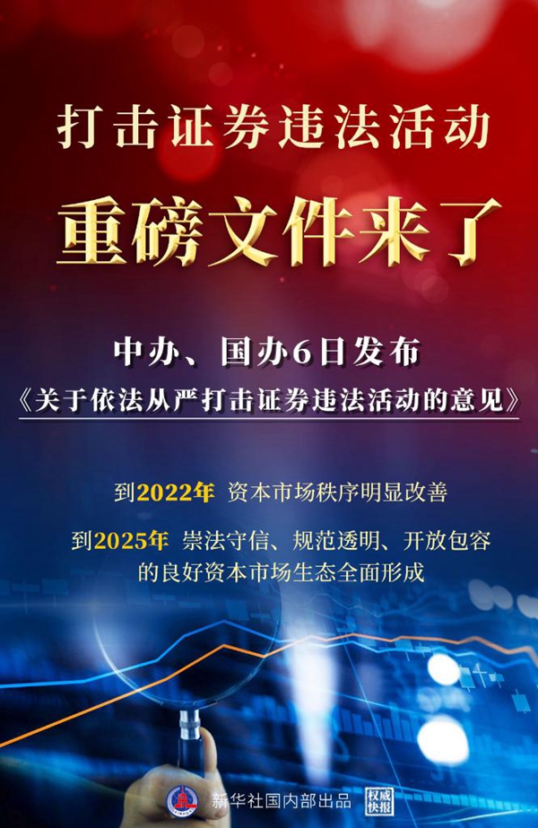 新華社北京7月6日電(記者張千千 劉慧)中共中央辦公廳、國務(wù)院辦公廳6日公開發(fā)布了《關(guān)于依法從嚴(yán)打擊證券違法活動(dòng)的意見》,對(duì)建立健全資本市場(chǎng)執(zhí)法司法體制機(jī)制、依法從嚴(yán)打擊證券違法活動(dòng)、推動(dòng)資本市場(chǎng)高質(zhì)量發(fā)展作出重要部署。