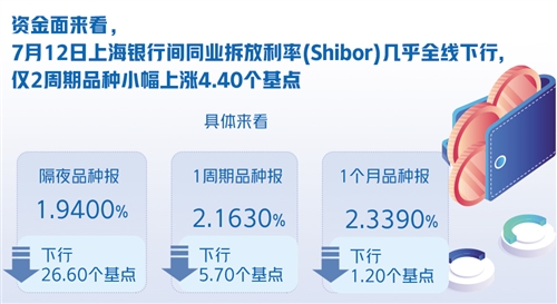 資金面來看,7月12日上海銀行間同業(yè)拆放利率(Shibor)幾乎全線下行,僅2周期品種小幅上漲4.40個基點。具體來看,隔夜品種報1.9400%,下行26.60個基點;1周期品種報2.1630%,下行5.70個基點;1個月品種報2.3390%,下行1.20個基點。