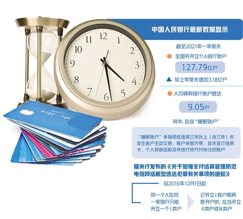 中國人民銀行最新數據顯示,截至2021年一季度末,全國共開立個人銀行賬戶127.79億戶,較上季度末增加3.18億戶,人均擁有銀行賬戶數達9.05戶。