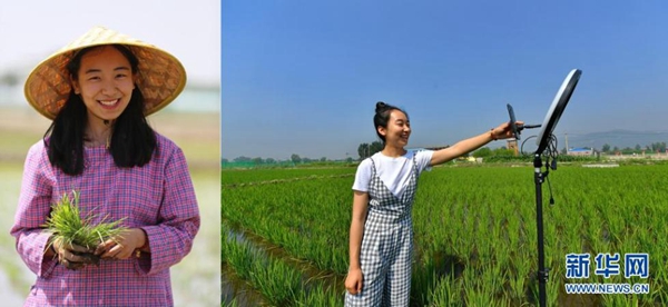 拼版照片:左圖為程玉嬌在太原市晉源區三家村水稻田里;右圖為程玉嬌在水稻田里進行直播(7月9日攝)。今年24歲的程玉嬌2019年留學回國后,選擇了返鄉創業發展稻魚菜綜合種養農業。晉源區三家村出產的大米遠近聞名,程玉嬌在社交平臺上開通了雙語直播,在科普水稻知識的同時拓展銷售渠道,不僅生意做得風風火火,自己也變成了小有名氣的“網紅”。