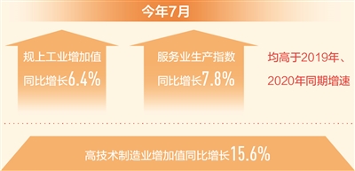 工業、服務業穩步增長。7月,全國規模以上工業增加值同比增長6.4%,全國服務業生產指數同比增長7.8%,均高于2019年、2020年同期增速;中國制造業采購經理指數為50.4%,服務業商務活動指數為52.5%,均連續17個月高于臨界點;服務業業務活動預期指數為60.1%,持續位于較高景氣區間。