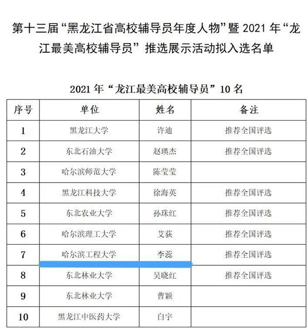 此次活動共評選出“第十三屆黑龍江省高校輔導員年度人物”11名,“2021年龍江最美高校輔導員”10名。哈工程輔導員梁艷艷、李蕊憑借高水平的專業能力、優異的工作業績以及認真負責的工作精神,在眾多評選者中脫穎而出。