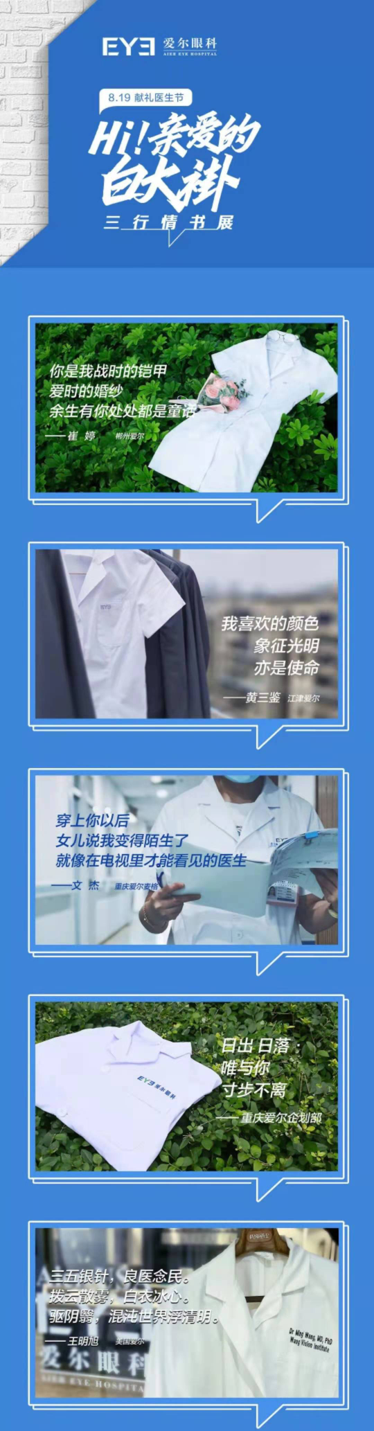 除了溫情脈脈、感動(dòng)滿滿的系列微電影,愛爾眼科還啟動(dòng)了醫(yī)師節(jié)“三行情書”征集活動(dòng)。溫柔細(xì)致、多才多藝的醫(yī)生們,用他們或細(xì)膩、或豪放的筆觸,寫下了自己對(duì)“白大褂”真摯的情感。活動(dòng)開展以來,共收到海內(nèi)外情書作品近2000件,最終此次活動(dòng)共評(píng)選出“最美情書”、“最佳告白”共100個(gè)優(yōu)秀作品。(愛爾眼科)