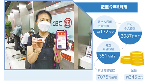 數據顯示,截至9月10日,工行北京分行試點的數字人民幣應用場景達8萬多個,集中在與社會民生緊密相關的交通出行、餐飲住宿、購物消費、旅游觀光、醫療衛生、通信服務、票務娛樂7大類場景。中國人民銀行近期發布的《中國數字人民幣的研發進展》白皮書顯示,截至今年6月末,數字人民幣試點場景已超132萬個,開立個人錢包2087萬余個、對公錢包351萬余個,累計交易筆數7075萬余筆、金額約345億元。