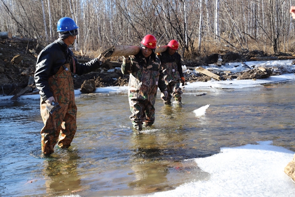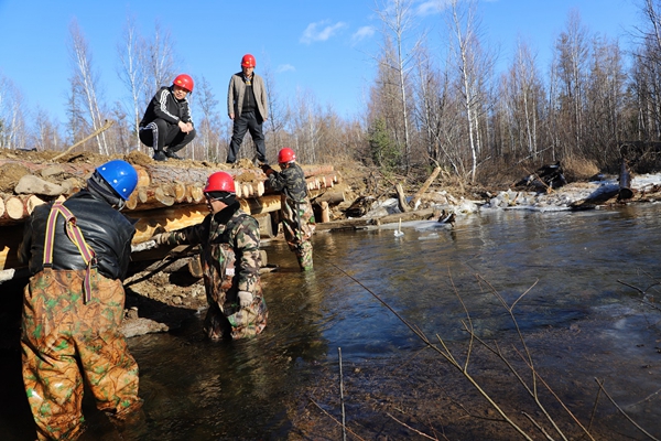 阿木爾林業局多種經營公司職工涉水檢查新建橋梁安全系數。