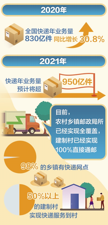 當前,快遞年業(yè)務量以每年遞增100億件的速度持續(xù)高速增長。據(jù)國家郵政局預測,2021年快遞年業(yè)務量將超950億件。