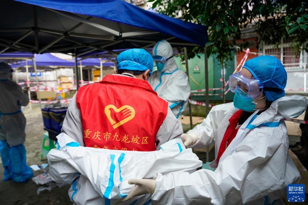 11月4日,在重慶九龍坡區九龍街道,青年志愿者相互幫助穿防護服。