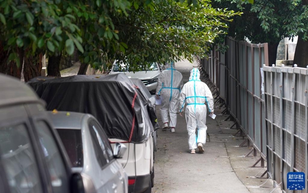 11月4日,在重慶九龍坡區九龍街道,兩名身穿防護服的青年志愿者走向自己負責的樓棟。