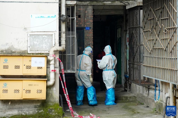 11月4日,在重慶九龍坡區九龍街道,兩名身穿防護服的青年志愿者準備入戶核對信息。
