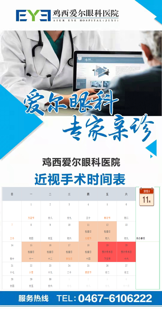 雞西愛爾眼科醫院近視手術時間表: