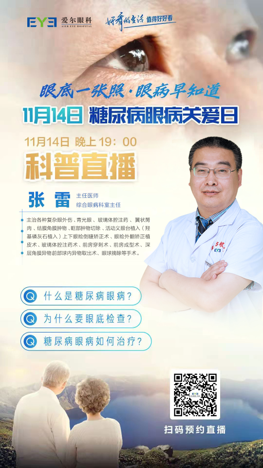 為提高糖尿病患者對糖尿病眼病的認知、加強自我保健意識,雞西愛爾眼科醫院將11月14日晚19:00舉辦糖尿病眼病關愛視頻號直播,通過科普講座與答疑互動的方式,全面講解糖尿病眼病的相關知識,幫助您和家人解決眼健康煩惱。