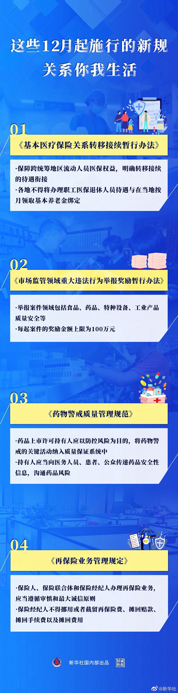 明確醫保關系的轉移接續辦法,讓跨統籌地區流動人員的醫保權益更有保障;舉報市場監管領域重大違法行為可獲獎勵,每起案件的獎勵金額上限為100萬元;進一步完善藥物警戒質量管理規范,強化藥品上市許可持有人的安全監管責任……戳大圖,哪條你最期待?(新華社記者白陽 海報設計張晨光)