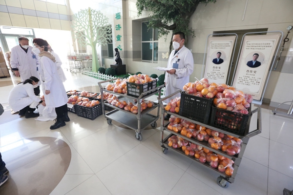 黑龍江經濟網訊(魏然 李麗 祝東 梁新立) 12月7日,在哈爾濱醫科大學附屬哈爾濱兒童醫院,30箱總重700多斤的蘋果和桔子,被一箱箱運進住院處病房,由行政后勤人員送到每個病房患兒家庭手中,讓在院的孩子們補充營養。