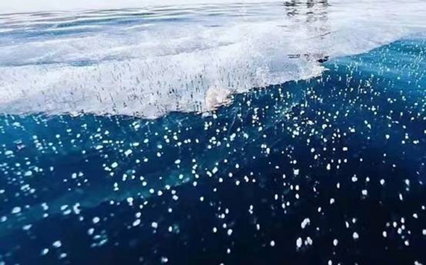 “冰泡”是由湖底植物釋放出的沼氣(甲烷)在上升過程中,因極寒氣溫導致冰封速度過快,被“鎖”在冰層之中而形成。目前,全世界僅有3個著名的冰泡湖,北極漠河冰泡湖是中國最北唯一的“冰泡奇觀”。觀音山“冰泡”晶瑩剔透、造型奇特、惟妙惟肖,有的形似“飛碟”一飛沖天,有的形似“珊瑚”美輪美奐,有的形似“觀音”端坐蓮臺。形態各異的“冰泡”形成一幅幅精美的冰雪藝術畫卷,成為漠河冬季最火爆的網紅打卡地。