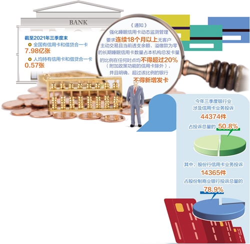 近年來,我國銀行業(yè)金融機(jī)構(gòu)信用卡業(yè)務(wù)快速發(fā)展,在便利群眾支付和日常消費(fèi)等方面發(fā)揮了重要作用。人民銀行發(fā)布的數(shù)據(jù)顯示,截至2021年三季度末,全國有信用卡和借貸合一卡7.98億張,人均持有信用卡和借貸合一卡0.57張。發(fā)卡量激增的同時(shí),行業(yè)亂象也被各界詬病,尤其是消費(fèi)者針對(duì)信用卡過度營(yíng)銷、亂收費(fèi)等問題的投訴量近年來居高不下。