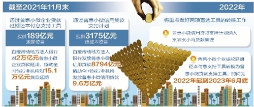 數據顯示,截至2021年11月末,人民銀行通過普惠小微企業貸款延期還本付息支持工具,提供了189億元激勵資金,直接帶動地方法人銀行對2萬億元普惠小微企業貸款延期,撬動全國銀行業機構對15.1萬億元貸款延期。人民銀行通過普惠小微信用貸款支持計劃提供3175億元低成本資金,直接帶動地方法人銀行發放普惠小微信用貸款8794億元,撬動全國銀行業機構發放普惠小微信用貸款9.6萬億元,取得了明顯的效果。
