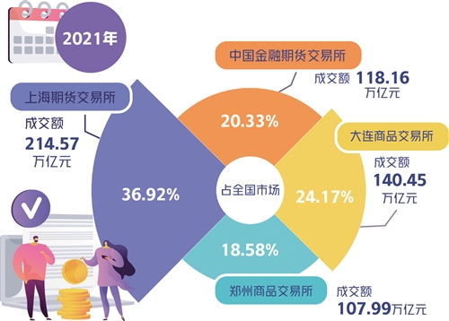 數據顯示,上海期貨交易所2021年成交量為24.45億手,成交額為214.57萬億元,同比分別增長14.9%和40.4%,分別占全國市場的32.55%和36.92%。