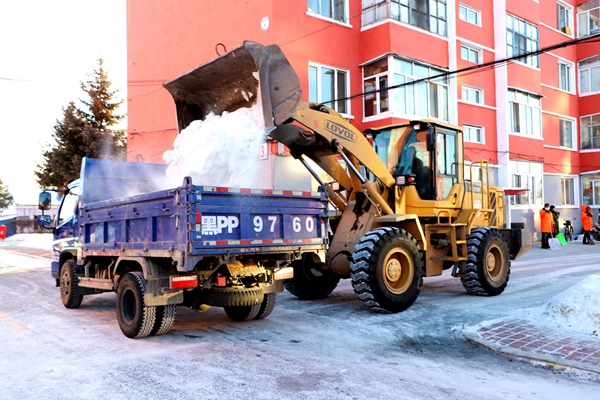 鑒于此,林業局環衛隊組織10多名環衛工,出動兩臺翻斗車、一臺裝載機,對28棟居民樓房前的硬化地面積雪進行“大掃除”,擴大步行道面積,方便居民出行。