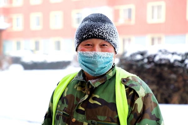 阿木爾林業局環衛隊職工單廣躍冒嚴寒清理生活垃圾,口罩、帽子上結滿冰霜(王力 攝)