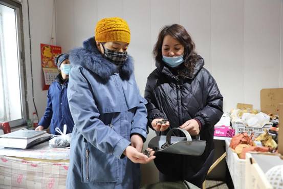 阿木爾菌業負責人趙榮華(右一)在向顧客介紹黑木耳的泡發率等指標(王力 攝)