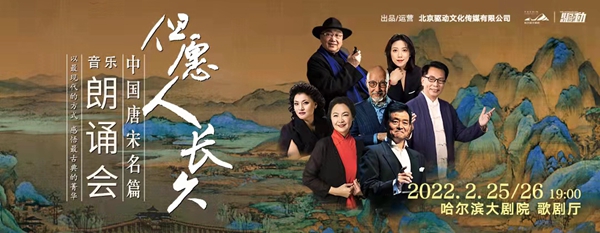 2月25、26日,“但愿人長久——中國唐宋名篇音樂朗誦會”將以全新陣容再度亮相冰城舞臺,由指揮家高嵩執棒,黑龍江省歌舞劇院有限公司交響樂團、民族樂團、合唱團共同呈現,朗誦表演藝術家濮存昕、喬榛、張晶、張宏聯袂著名歌唱家楊小勇、么紅,以詩樂相伴的方式再現盛唐兩宋的詩詞歌賦。