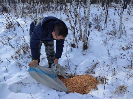 呼中林業局森林資源管理科工作人員山間為野生動物投放食物(劉玉龍 攝)