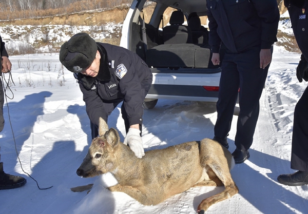 2月2日,正值大年初二,塔河縣公安局森保大隊民警接到鎮內群眾的報警求助電話,稱一只疑似狍子的野生動物誤闖進自己家倉庫院內,民警立刻趕往現場。到達現場后,民警判斷這是一只成年狍子。報警群眾稱和親戚費了不少勁才把這只誤闖居民區的袍子抓住,為了防止其亂跑受到意外傷害專門用繩子將其腿系住,然后立刻報了警。經過仔細查驗,森保民警確認袍子沒有明顯傷病。在精心照顧和觀察了兩個小時后,看到其行動能力正常,精神狀態良好,符合放生條件后,森保大隊民警和報警群眾將這只狍子放歸了大自然。“拜年”狍子在完成了自己的心愿后在人們的目送下歡快地回歸了山林。