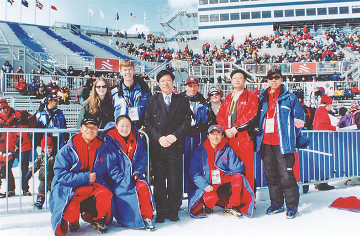 2002年我國首次派團參加冬殘奧會,圖為代表團成員與志愿者合影。