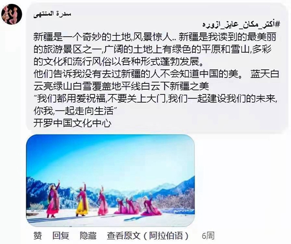 其中,來自埃及曼蘇拉的西德拉·蒙塔哈獲得本次活動的“最佳評論獎”。她在中心帖文下多次留言,“新疆風景迷人,是最美的旅游勝地之一。在廣袤的土地上有草原和雪山,沒有去過新疆的人,就不會知道中國的美……我想去那里滑雪、騎馬。”另外,她還想去北京吃炸醬面,去遼寧泡溫泉等。