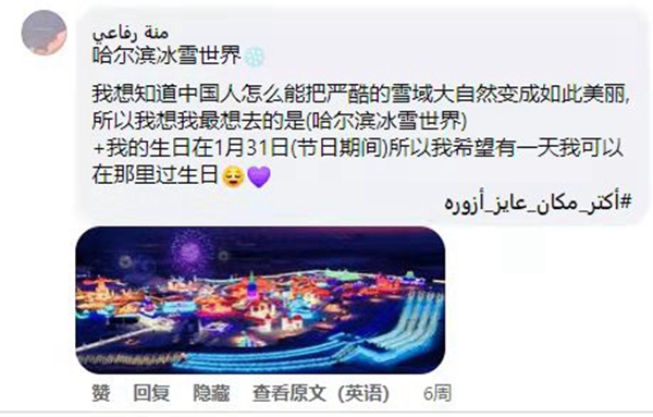 開羅中國文化中心臉書主頁超級粉絲艾曼·索比、曼娜·伊薩姆和羅飛三位網友獲得了優秀評論獎。艾曼·索比在留言中提出想去黑龍江大慶泡雪地溫泉;曼娜·伊薩姆在評論里說她想去哈爾濱極地公園游玩,想去牡丹江鏡泊湖的冰瀑跳水,想去吉林的查干湖看看;羅飛表示想到哈爾濱冰雪大世界去過生日。眾多網友也紛紛曬出了自己最想去的地方,新聞與媒體從業者加達·阿里想先去遼寧的滑雪場,然后再去采摘丹東的草莓;來自明亞省的緒瑪·穆斯塔法表示想去內蒙古東方冰雪小城阿爾山旅游;畢業于蘇哈格大學的薩蒙·瓦赫想去北京看奧林匹克塔等。網友們各抒己見,暢想去中國的夢幻旅程。