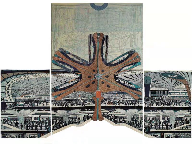 版畫作品《鳳凰展翅——北京大興國際機場》描繪了北京大興機場如鳳凰展翅、騰飛天際的恢宏景象。畫家采用空間翻轉,將機場內外現代化、人性化、藝術化的先進設施和繁忙的國際交流同時表現出來。