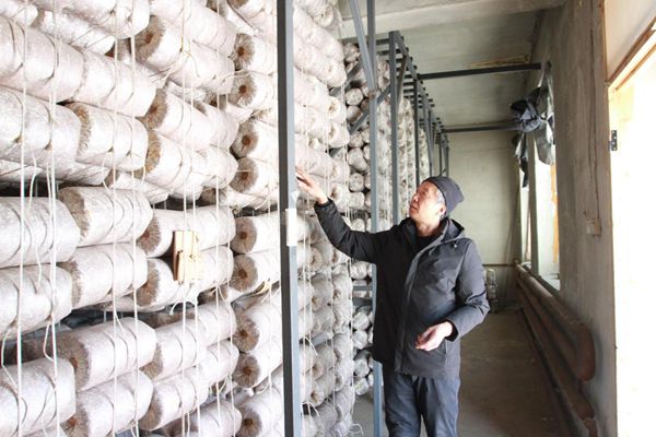 靈芝養殖戶在菌包培養室內查看培養室的溫度、濕度是否適宜靈芝生長(趙明 攝)