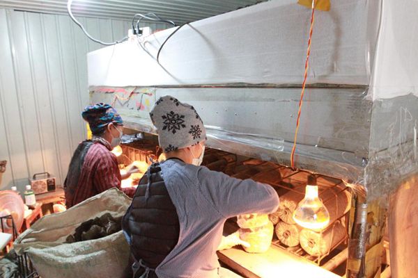 圖強林業局靈芝種植園內,技術人員在進行靈芝菌包注菌(趙明 攝)