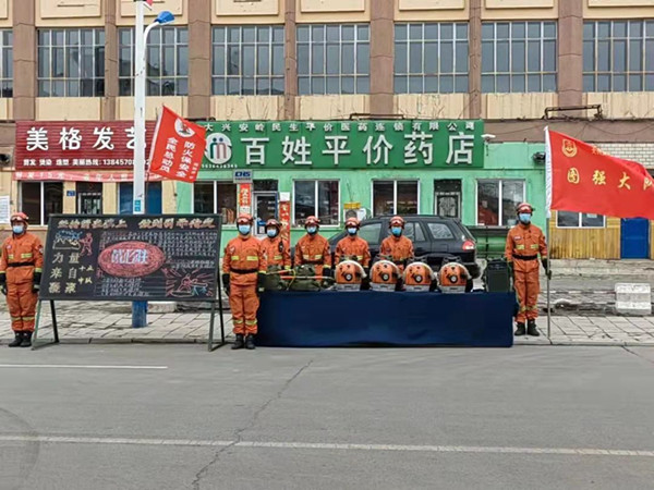 圖強林業局設立定點宣傳臺,通過展板和森林防滅火裝備向群眾普及森林防火常識(趙明 攝)