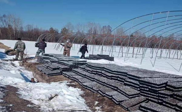 為了能更好地完成2022年的育苗生產計劃,苗圃領導班子帶領單位業務骨干到苗圃地和輕基質生產車間進行實地調研,由于氣候原因,圃地積雪未消,生產用泥炭土凍結嚴重,輕基質生產車間沒有供暖設備,無法在苗圃開展輕基質容器杯生產工作。
