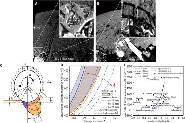 團隊成員根據(jù)月球車車輪與月面作用的信息和地面力學模型估計了月壤的力學特性,結(jié)果表明,月壤風化層的承壓特性與地球上的干沙和沙壤土類似,與美國阿波羅計劃中的典型月壤相比具有更強的承壓特性。在多個不同地點的圖像中,觀察到“玉兔二號”車輪粘附有大塊團狀土壤,而“玉兔號”車輪基本不存在粘土現(xiàn)象,這表明,嫦娥四號著陸區(qū)附近月壤內(nèi)聚力較大,其原因可能是包含較高比例的凝集物,使土壤顆粒經(jīng)車輪碾壓更易團聚。