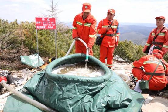 據(jù)了解,此次演練模擬小白山最高峰海拔1404米的“興安第一塔”附近偃松林發(fā)生火情,在海拔886米尋找到一處水源地,撲火隊員利用高揚(yáng)程山地引水泵向1150米處放置的儲水囊供水,同時架設(shè)第二臺水泵向山頂供水,兩臺水泵交叉接力成功將水引向小白山最高峰,噴淋“興安第一塔”,整個過程鋪設(shè)水帶全長3740延長米,垂直爬高519米。